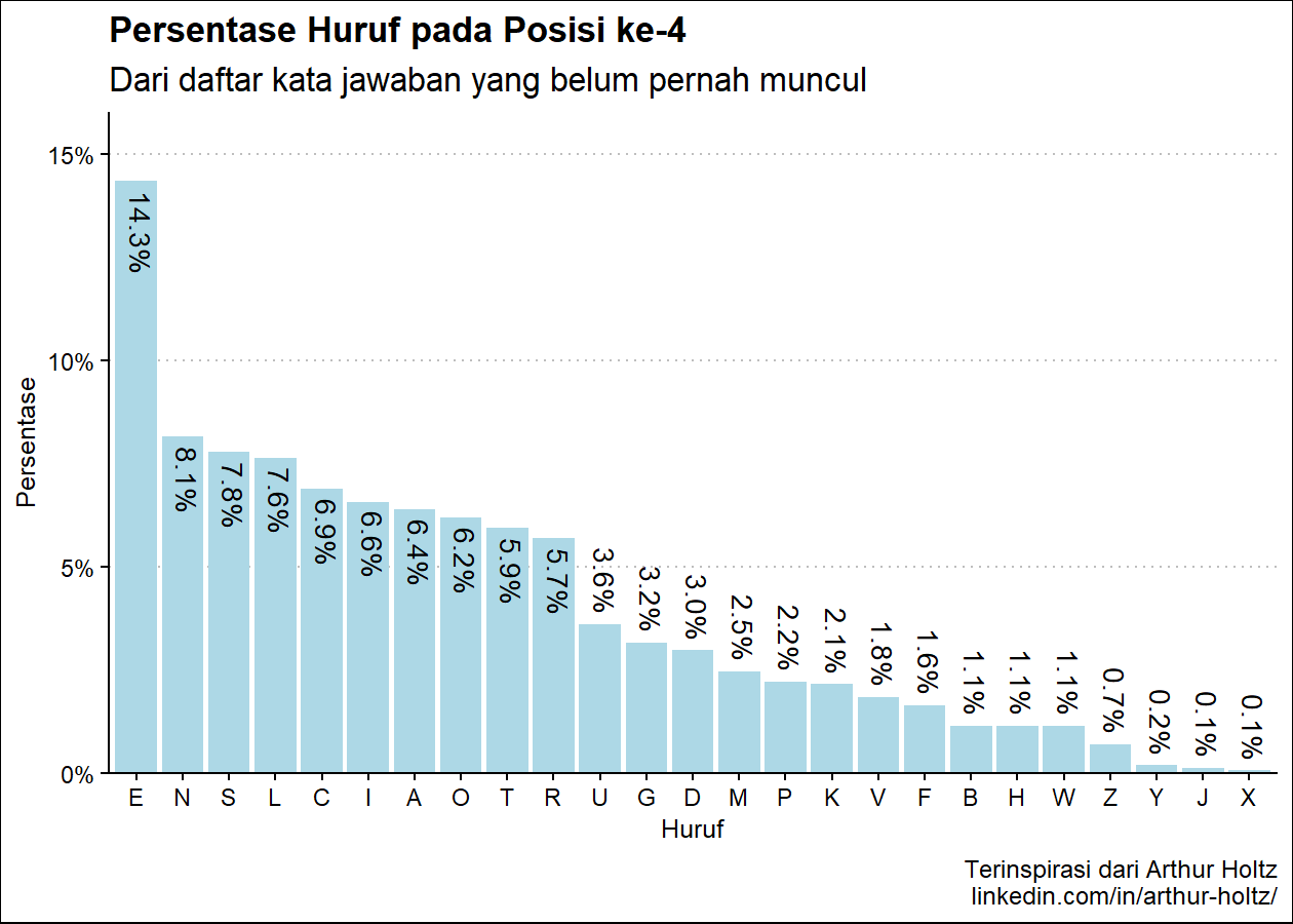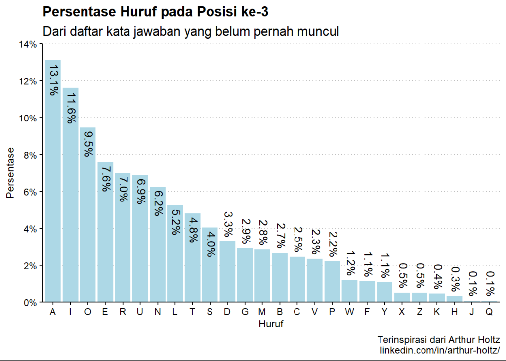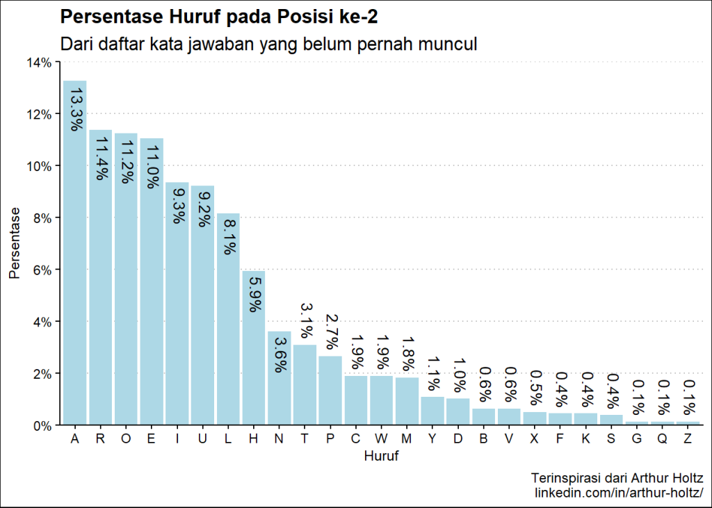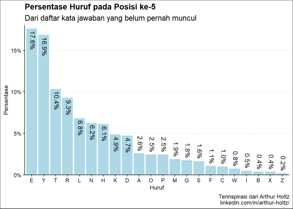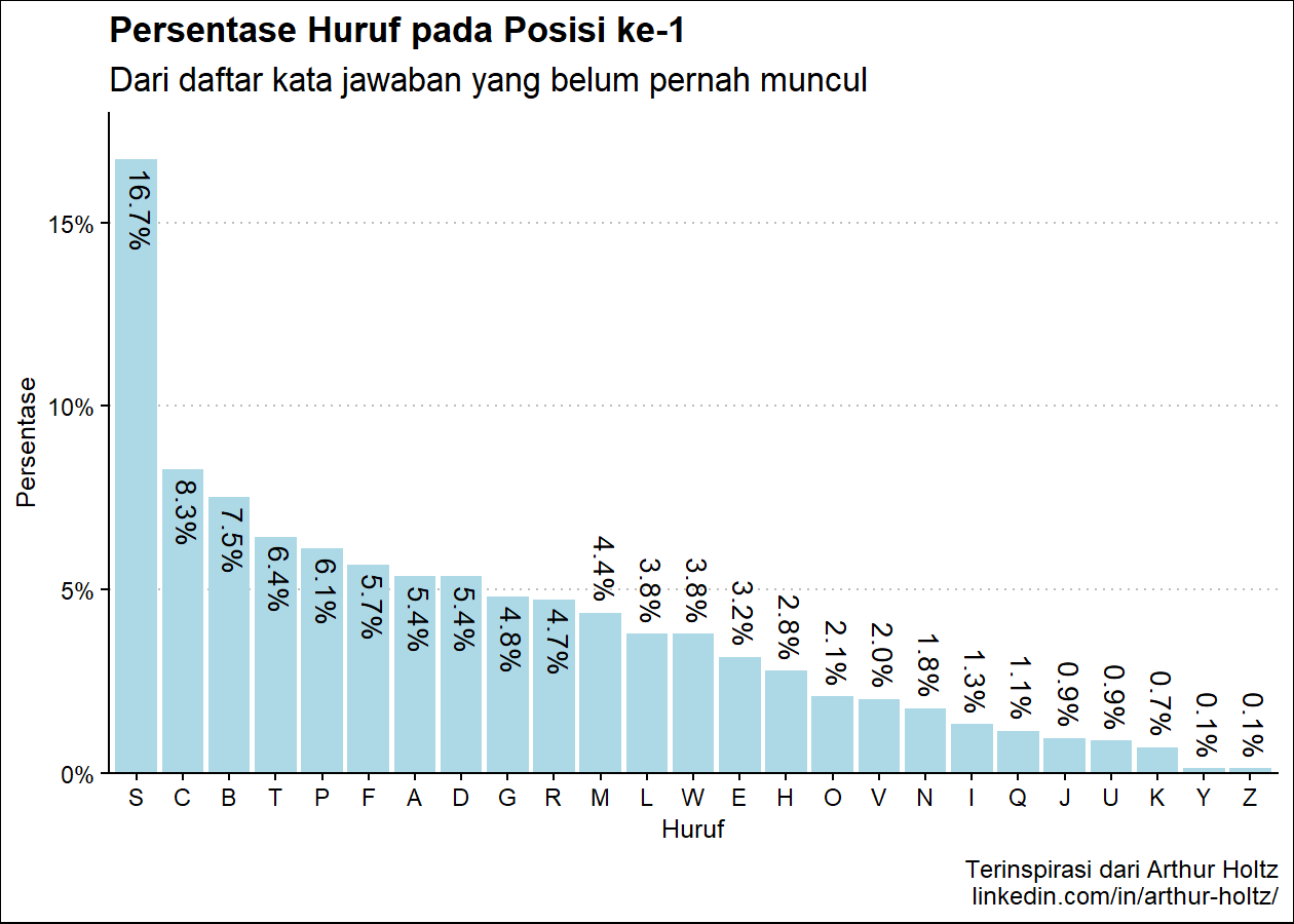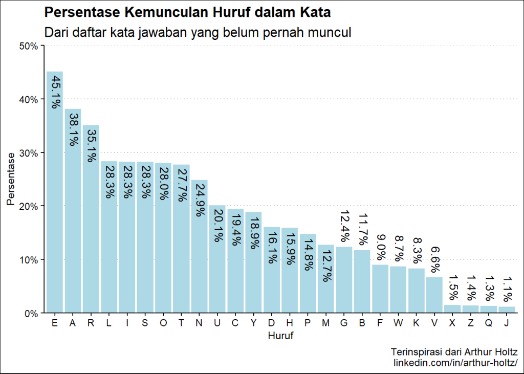 Sebagai latihan agar lebih terbiasa dengan bahasa R untuk analisis data, saya mencoba mereproduksi proyek Wordle Data Analysis oleh Arthur Holtz untuk menemukan kata terbaik dalam mengawali tebakan di game Wordle. Meski game tersebut saat ini sudah tidak viral lagi, tapi saya rasa analisis ini masih cukup berguna untuk belajar R.