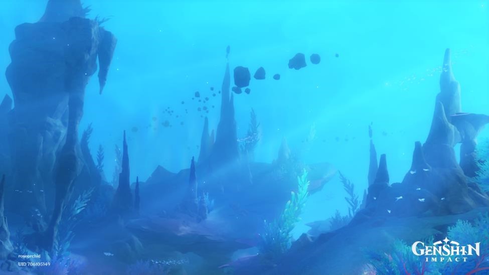 Sepertinya daerah pertama Sea of Bygone Era sudah bersih dari peti dan Hydroculus. Hydro Sigils belum nyampe 1500. Biar bisa nge-level up Fountain of Lucine sekaligus kayanya memang harus beresin semua area di Sea of Bygone Era dulu. Btw, area bawah laut memang menarik dan warna-warni, tapi rasanya pemandangan yang menarik buatku malah siluet burem yang kadang ada di ujung peta. Maksudku, coba lihat ini: