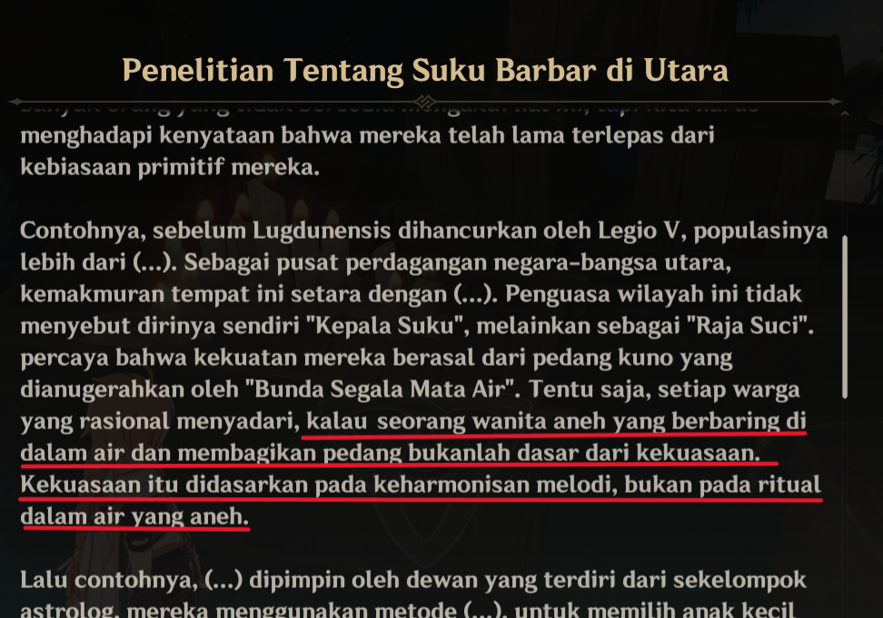 Ngomong-ngomong soal world quest yang baru diselesaikan, ceritanya lumayan, cutscene nya cantik (dan ada semacam QTE), tapi dialognya lagi-lagi agak bikin sulit buat bikin ngerasa ‘oh ceritanya gitu’. Mungkin masalah terjemahan, mungkin karena gaya bicara karakter saat dialog, atau memang gaya penceritaannya agak sulit dipahami. Belakangan cerita di Genshin selalu seperti ini, dan saya rasa baru terasa saat masuk Fontaine. Atau sayanya yang mulai ga sabar baca ceritanya.